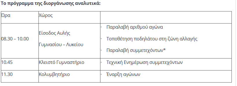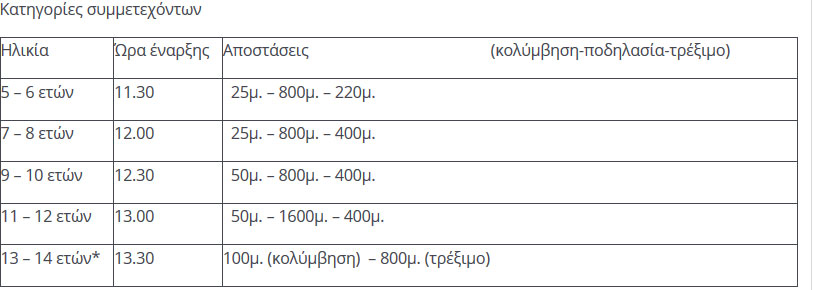 *Οι συμμετέχοντες της συγκεκριμένης ηλικιακής κατηγορίας θα λάβουν μέρος μόνο στα αγωνίσματα της κολύμβησης και του τρεξίματος.
