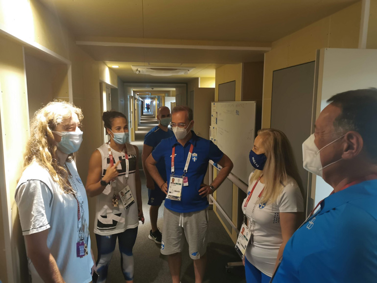 H διευθύντρια της ΕΟΕ Τένια Μαυροπούλου ανέλυσε στον κ. Καπράλο όλα τα λειτουργικά θέματα, τονίζοντας ότι έως τώρα δεν έχει παρουσιαστεί κανένα πρόβλημα στην ελληνική ομάδα.