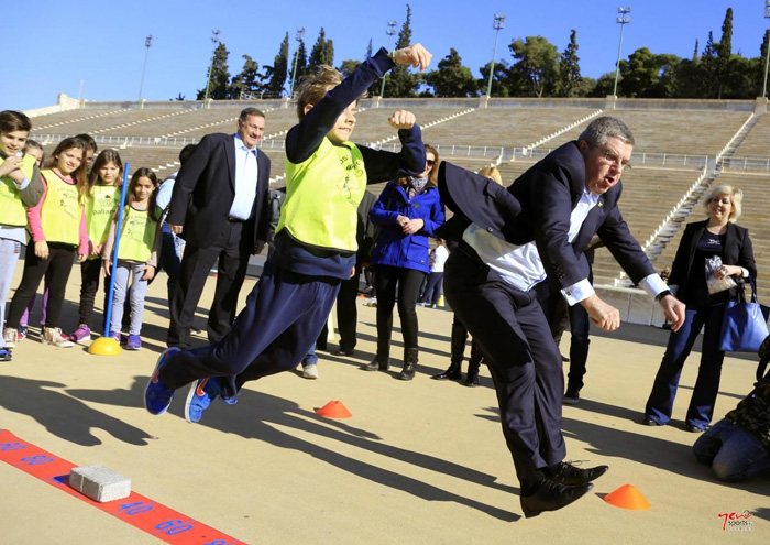 Ο Τόμας Μπαχ ξεναγήθηκε στους χώρους του Σταδίου, στο οποίο αναβίωσαν οι Ολυμπιακοί Αγώνες του 1896 και με τη βοήθεια της υπεύθυνης του προγράμματος «Αγαπώ τον αθλητισμό-Kids’ Athletics» Ντενίζ Παναγοπούλου, είδε από κοντά την εφαρμογή του συγκεκριμένου project της Ε.Ο.Ε. που απευθύνεται σε μαθητές δημοτικών σχολείων και τους φέρνει πιο κοντά μέσω της εξάσκησης, στα αθλήματα του στίβου, του μπάσκετ και του βόλεϊ. Ο Πρόεδρος της Δ.Ο.Ε. μίλησε με τα παιδιά του 46ου Δημοτικού Σχολείου Αθηνών που συμμετείχαν στο πρόγραμμα και δεν δίστασε να δοκιμάσει τις δυνάμεις του μαζί με τους μαθητές, στα αγωνίσματα του στίβου.