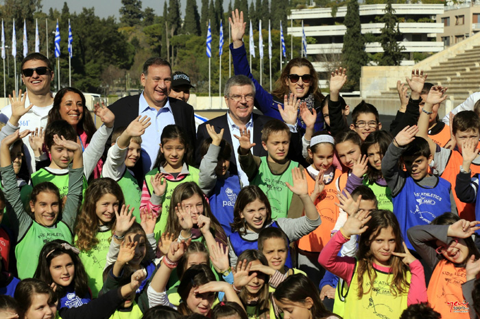 Στο τέλος φωτογραφήθηκε μαζί με τα παιδιά, έδωσε σε όλα από ένα μικρό αναμνηστικό δώρο, ένα σηματάκι με τους πέντε Ολυμπιακούς Κύκλους και δεν έκρυψε τον ενθουσιασμό του: «Ήταν μία φανταστική εμπειρία να έρθω στο Παναθηναϊκό Στάδιο, εδώ απ’ όπου ξεκίνησαν όλα για τους σύγχρονους Ολυμπιακούς Αγώνες. Κι ήταν ακόμα καλύτερα που μοιράστηκα αυτό το συναίσθημα με τις επόμενες γενιές των αθλητών, με όλα αυτά τα παιδιά. Είδα στα μάτια τους για τον αθλητισμό και για την Ολυμπιακή εμπειρία που έζησαν. Θέλω να ευχαριστήσω και να συγχαρώ την Ελληνική Ολυμπιακή Επιτροπή και τον Πρόεδρο της Σπύρο Καπράλο για την εφαρμογή του προγράμματος που μετουσιώνει στην πράξη το Ολυμπιακό Πνεύμα» τόνισε ο Πρόεδρος της Δ.Ο.Ε. Ο Πρόεδρος της Ελληνικής Ολυμπιακής Επιτροπής αφού ευχαρίστησε τον Τόμας Μπαχ για τα καλά του λόγια, πρόσθεσε: «Είναι πολύ σημαντικό που υποδεχθήκαμε σήμερα τον Πρόεδρο Μπαχ στο Παναθηναϊκό Στάδιο και του παρουσιάσαμε το πρόγραμμα «Αγαπώ τον αθλητισμό-Kids’ Athletics», στο οποίο από το 2010 που το ξεκινήσαμε, έχουν συμμετάσχει 105.000 μαθητές από περισσότερα από 1.500 σχολεία όλης της χώρας. Για μας στην Ελληνική Ολυμπιακή Επιτροπή αποτελεί η χαρά των παιδιών κατά την επίσκεψη τους στο ιστορικό αυτό Στάδιο και τα σχόλια που αφήνουν στο βιβλίο των επισκεπτών», επισήμανε ο Σπύρος Καπράλος.