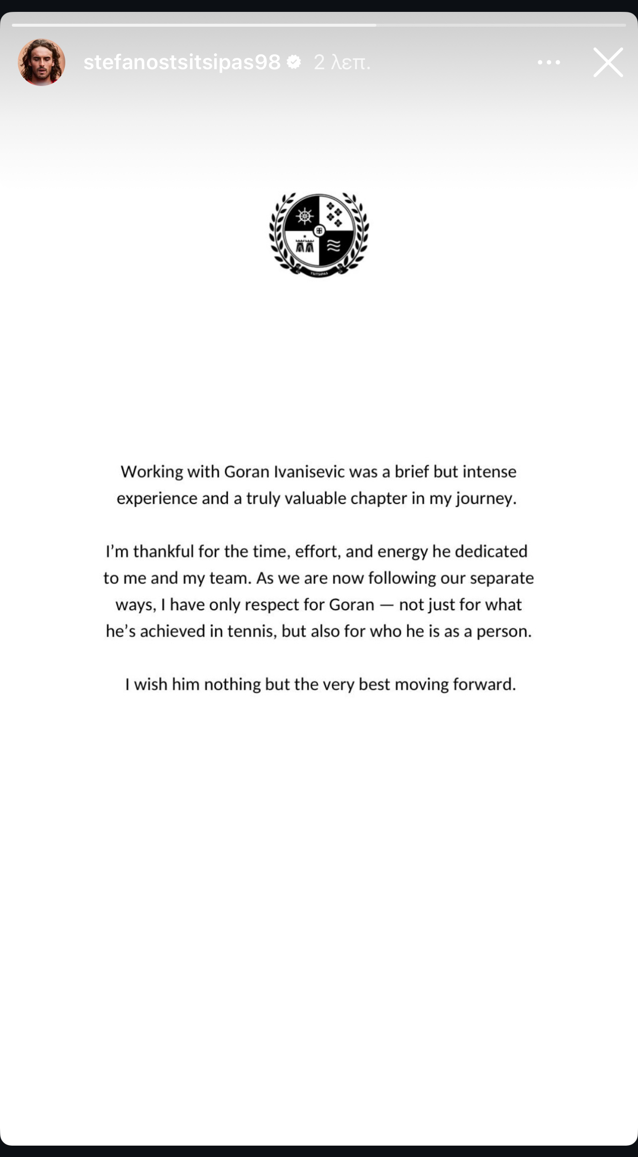 Ούτε δύο μήνες δεν κράτησε η συνεργασία ανάμεσα στον Στέφανο Τσιτσιπά και τον Γκόραν Ιβανίσεβιτς. Ο Έλληνας τενίστας γνωστοποίησε με ανάρτησή του στον  προσωπικό του λογαριασμό στο Instagram, τη λήξη της συνεργασίας του με τον Κροάτη προπονητή.