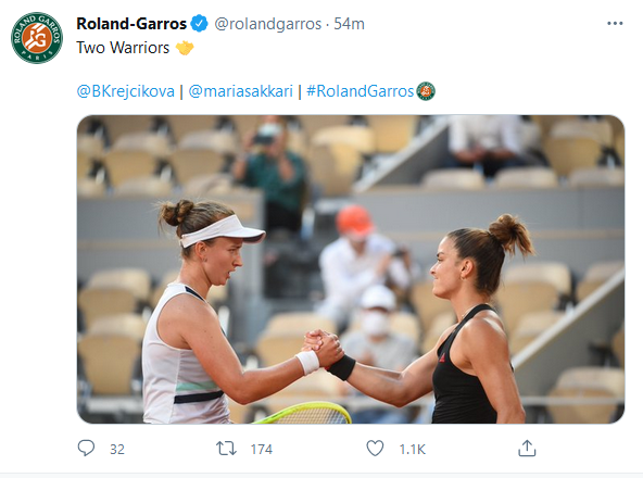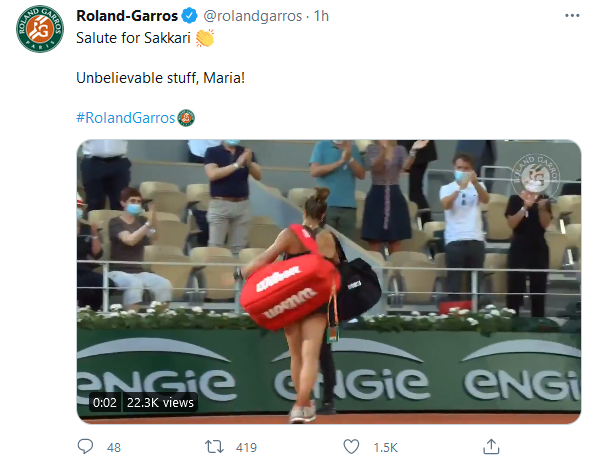 Στην πρώτη τους ανάρτηση στον λογαριασμό του Ρολάν Γκαρός στο twitter χαρακτήρισαν «πολεμίστρια» τη Σάκκαρη, ενώ σε αυτήν που ακολούθησε την αποχαιρέτησαν γράφοντας: «Απίστευτα πράγματα, Μαρία».