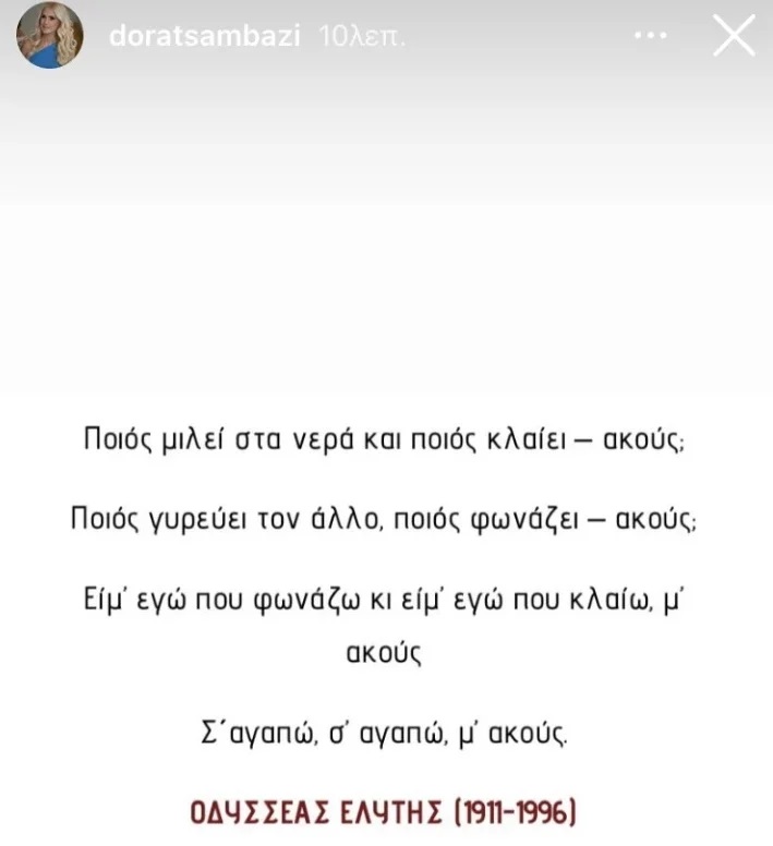 Η σύζυγός του, Δώρα Τσαμπάζη, τον αποχαιρέτησε με απόσπασμα από το «Μονόγραμμα» του Οδυσσέα Ελύτη, μέσα από τον λογαριασμό της στο Instagram: