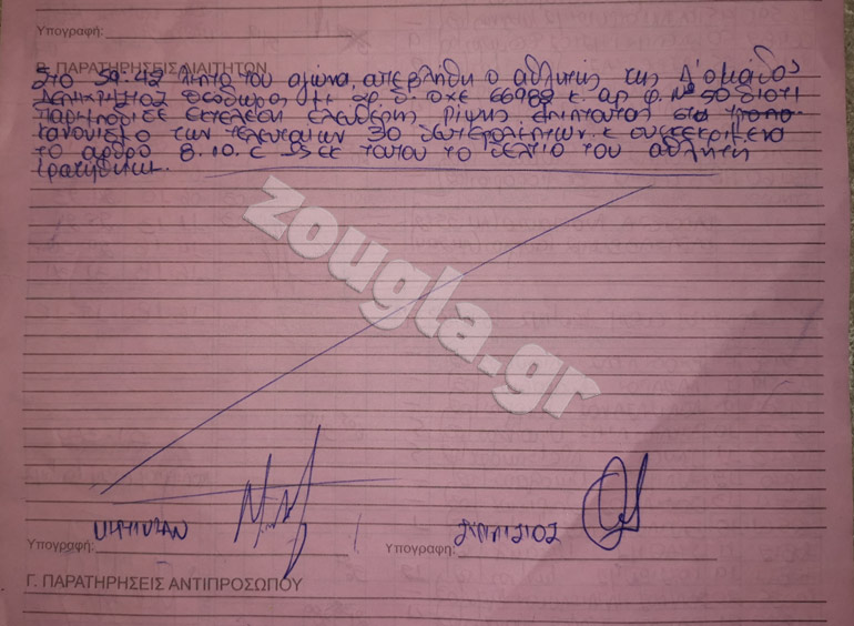 Οι διαιτητές σημείωσαν στο φύλλο αγώνα: «Στο 59:42 λεπτό του αγώνα, απεβλήθη ο αθλητής της Α’ ομάδας Δεληχρήστος Θεόδωρος, με αρ. Δ. ΟΧΕ 66982 & αρ. Φ. Νο 90, διότι παρεμπόδισε εκτέλεση ελεύθερης ρίψης εμπίπτοντας στον κανονισμό των τελευταίων 30 δευτερολέπτων & συγκεκριμένα το άρθρο 8.10.c. Ως εκ τούτου το δελτίο του αθλητή κρατήθηκε».