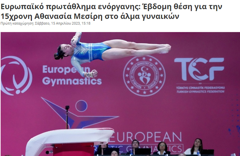 Ο κ. Τσοπάνογλου ολοκλήρωσε περιγράφοντας τη 15χρονη μαθήτρια της Α’ Λυκείου ως μία αθλήτρια που έχει όλο το μέλλον μπροστά της: «Με λίγη υπομονή και εφόσον είναι γερή, μπορεί να εξελιχθεί σε μία αθλήτρια πραγματικά ξεχωριστή στο άλμα. Είναι όμως πολύ καλή, επίσης, στη δοκό και στο έδαφος. Πρόκειται για μία αθλήτρια που καταλαβαίνει την ουσία της γυμναστικής και επικοινωνούμε εξαιρετικά».
