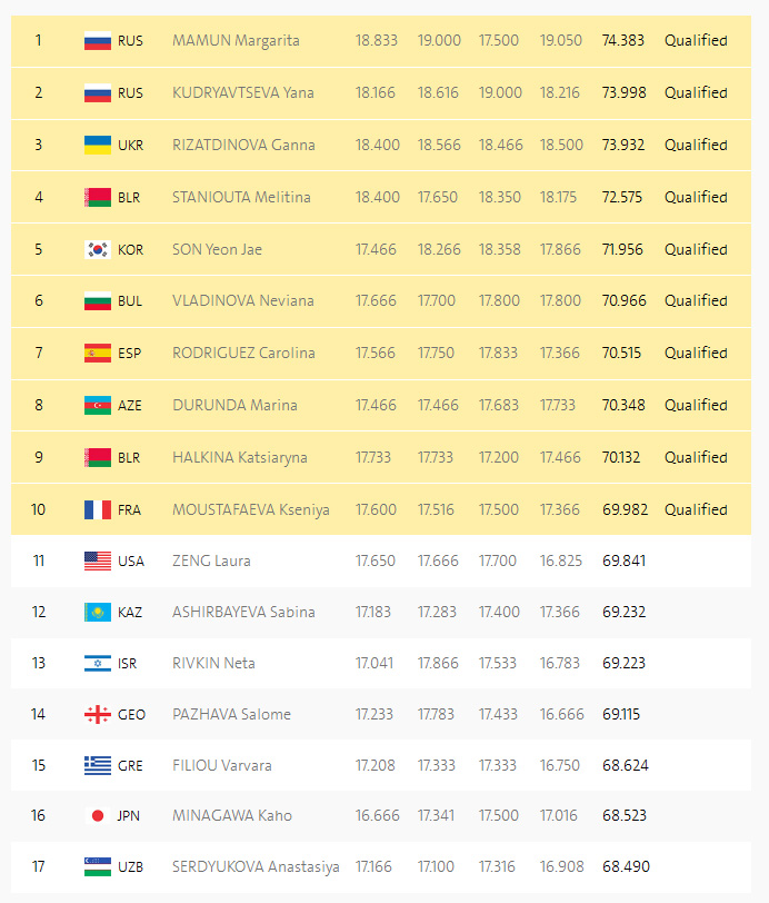 Στη μπάλα βαθμολογήθηκε με 17.333, στη στεφάνη 17.208, στις κορίνες 17.333 και στην κορδέλα 16.750.