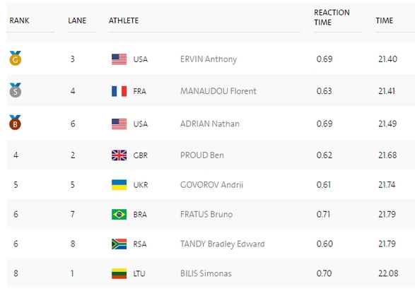 Μεγάλος νικητής ήταν ο Άντονι Έρβιν (21.40), ο οποίος έκανε την έκπληξη, αφήνοντας δεύτερο τον κάτοχο του τίτλου και μεγάλο φαβορί Φλοράν Μανοντού. Ο Γάλλος κολυμβητής ολοκλήρωσε την κούρσα σε 21.41. Τρίτος ήρθε ο Αμερικανός Νέιθαν Εϊντριαν (21.49).