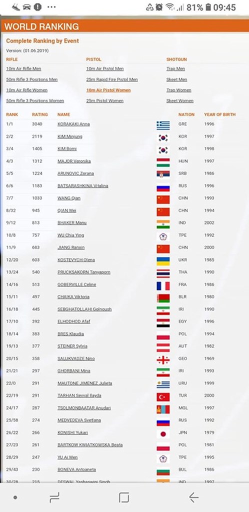 Η χρυσή ολυμπιονίκης του Ρίο ντε Τζανέιρο, Άννα Κορακάκη, ανέβηκε εκ νέου στο Νο1 της παγκόσμιας κατάταξης στα 10μ. αεροβόλο πιστόλι.