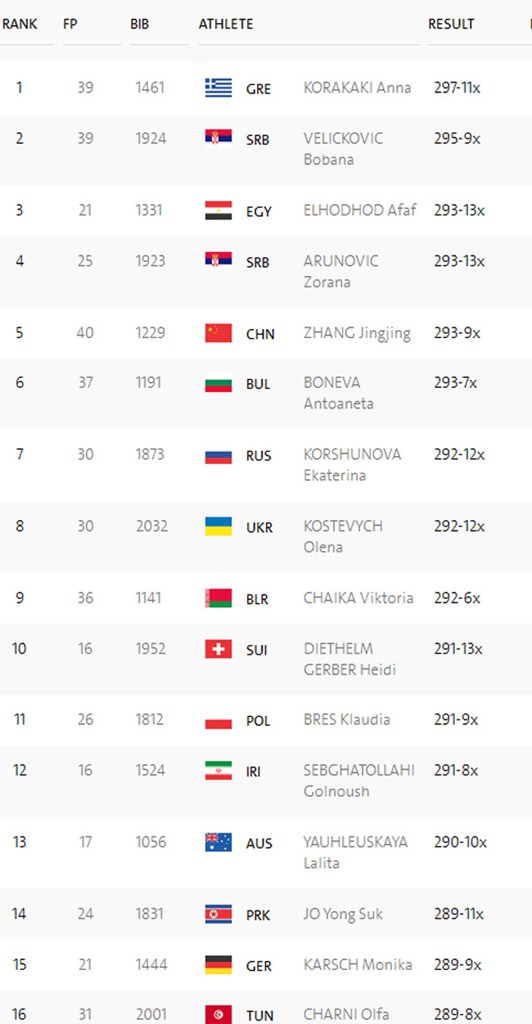 Η Άννα Κορακάκη πήρε την πρώτη θέση του πρώτου σκέλους των προκριματικών των 25 μέτρων στο πιστόλι γυναικών, στην σκοποβολή που διεξάγεται στο πλαίσιο των Ολυμπιακών Αγώνων του Ρίο. Η Ελληνίδα πέτυχε επίδοση 297/300 και άφησε στην δεύτερη θέση τη Σέρβα Βελίτσκοβιτς με 295/300.
