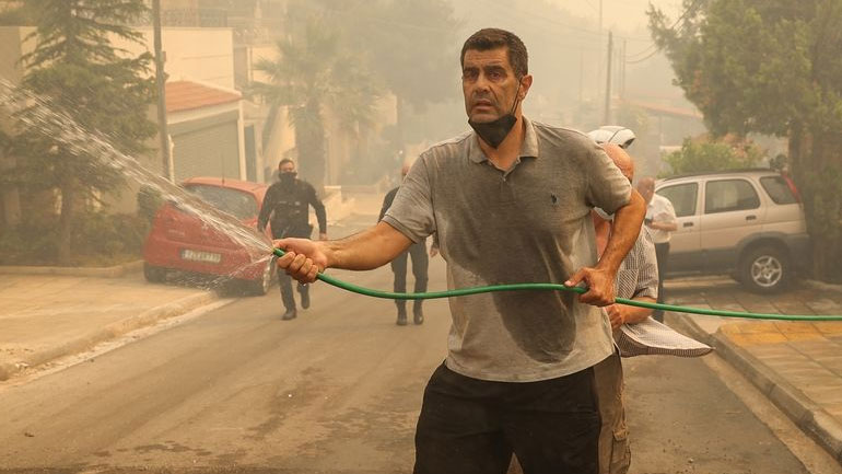 Συγκλονιστική είναι η φωτογραφία του Δημήτρη Καζάζη, ο οποίος προσπαθεί με ένα λάστιχο έξω από το σπίτι του να σβήσει τη φωτιά.