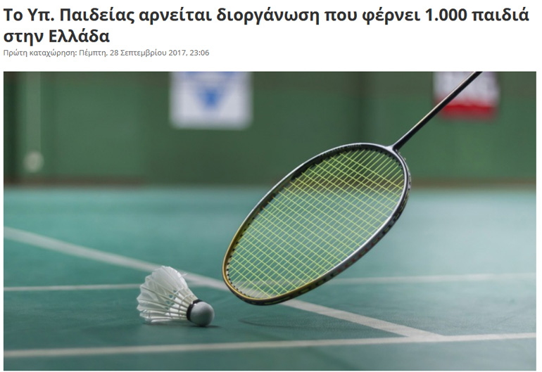 «Ερώτηση προς τους Υπουργούς Παιδείας, Έρευνας και Θρησκευμάτων κ. Κ. Γαβρόγλου και Πολιτισμού και Αθλητισμού κ. Λ. Κονιόρδου κατέθεσαν οι Χαρά Κεφαλίδου υπεύθυνη του Τομέα Πολιτισμού και Αθλητισμού και Γιάννης Κουτσούκος, υπεύθυνος του Κοινοβουλευτικού Τομέα Εργασίας Οικονομικών της Δημοκρατικής Συμπαράταξης. Η ερώτησή τους αφορά στην άρνηση του Υπουργείου Παιδείας για την ανάληψη διοργάνωσης του Παγκόσμιου Σχολικού Πρωταθλήματος Αντιπτέρισης (Badminton) το 2020 από τη χώρα μας με τη συμμετοχή 1.000 μαθητών.