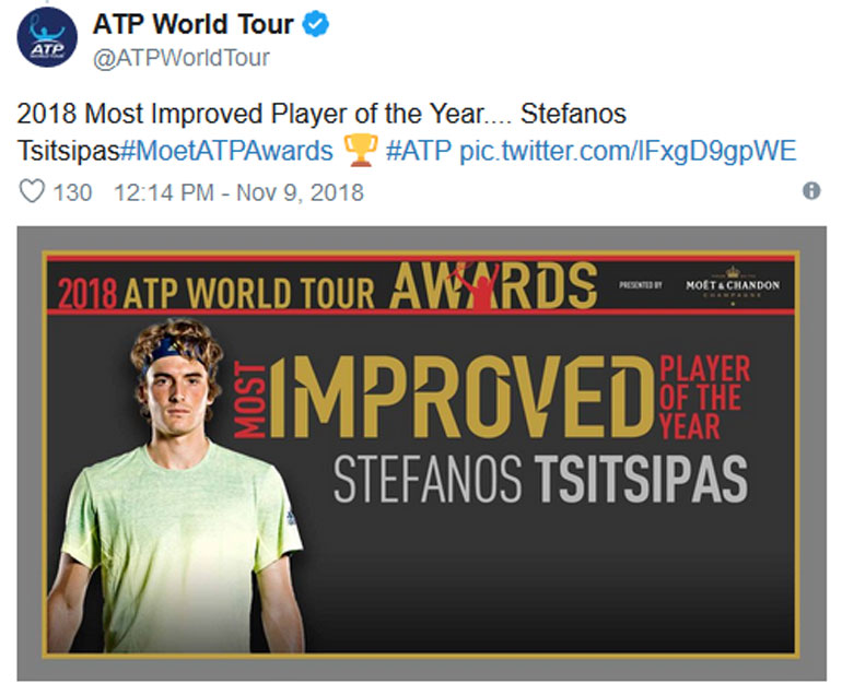 Ανακοινώθηκαν τα βραβεία της ΑΤΡ για το 2018, στα οποία φιγουράρει το όνομα του Στέφανου Τσιτσιπά, καθώς αναδείχθηκε ως ο «πιο βελτιωμένος παίκτης της χρονιάς» στον κόσμο.