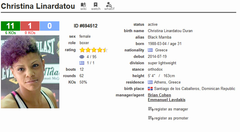Η Χριστίνα Λιναρδάτου αθλήτρια του Μανώλη Λαβδάκη του Perseas Club μετά την επιτυχία της εκτινάχθηκε στην τέταρτη θέση στα παγκόσμια rankings. Ο κορυφαίος αγώνας στον οποίο κέρδισε την Καναδή Kandi Wyatt πραγματοποιήθηκε στο αθλητικό κέντρο ΔΑΪΣ στο Μαρούσι στη διοργάνωση του Στέλιου Πολίτη GODS OF WAR υπό την αιγίδα του Συνδέσμου Επαγγελματικής Πυγμαχίας με πρόεδρο το Γιώργο Στεφανόπουλο και σουπερβάιζορ της WBO την κ. Μάριον Παλατιν και ομάδα διαιτητών της WBO.