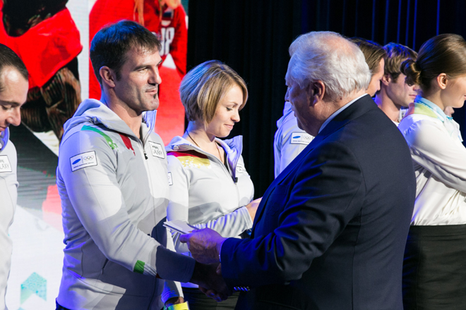 Το Μέλος της ΔΟΕ Vitaly Smirnov παραδίδει την επίσημη συσκευή κινητής τηλεφωνίας των Ολυμπιακών Αγώνων, το Samsung GALAXY Note 3, στον Armin Zöggeler (Ιταλία) και στους υπόλοιπους αθλητές της Samsung GALAXY ομάδας.