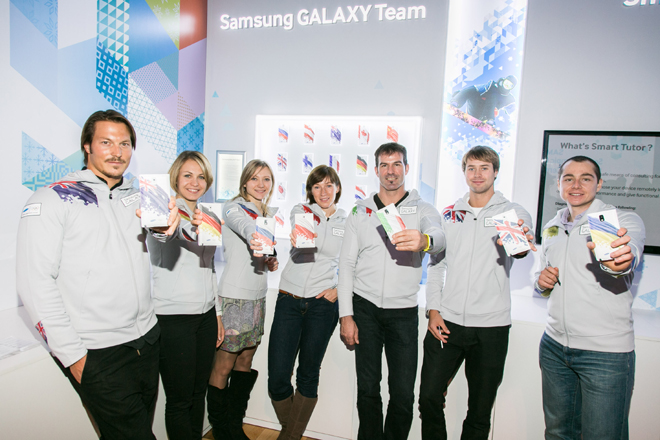 Τα μέλη της Samsung GALAXY ομάδας Yosyf Penyak (Ουκρανία), Alex Pullin (Αυστραλία), Magdalena Neuner (Γερμανία),Billy Morgan (Ηνωμένο Βασίλειο), Liudmila Privivkova (Ρωσία), Armin Zöggeler (Ιταλία), Katarzyna Bachleda-Curuś (Πολωνία) χρησιμοποιώντας την επίσημη συσκευή κινητής τηλεφωνίας των Ολυμπιακών Αγώνων, το Samsung GALAXY Note 3, στην τελετή έναρξης της πρωτοβουλίας Samsung Smart Olympic Games.