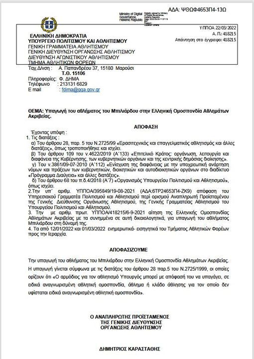 Ιστορική μέρα η Τρίτη 22/3/2022 για το Ελληνικό μπιλιάρδο. Το υπουργείο Πολιτισμού & Αθλητισμού, αναγνώρισε και πάλι ως επίσημο άθλημα το Γαλλικό μπιλιάρδο στην Ελλάδα, εντάσσοντας το στην Ομοσπονδία Αθλημάτων Ακριβείας!