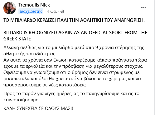 Ο πρόεδρος της Ελληνικής Ένωσης Μπιλιάρδου, Νίκος Τρεμούλης, έκανε την ακόλουθη δήλωση