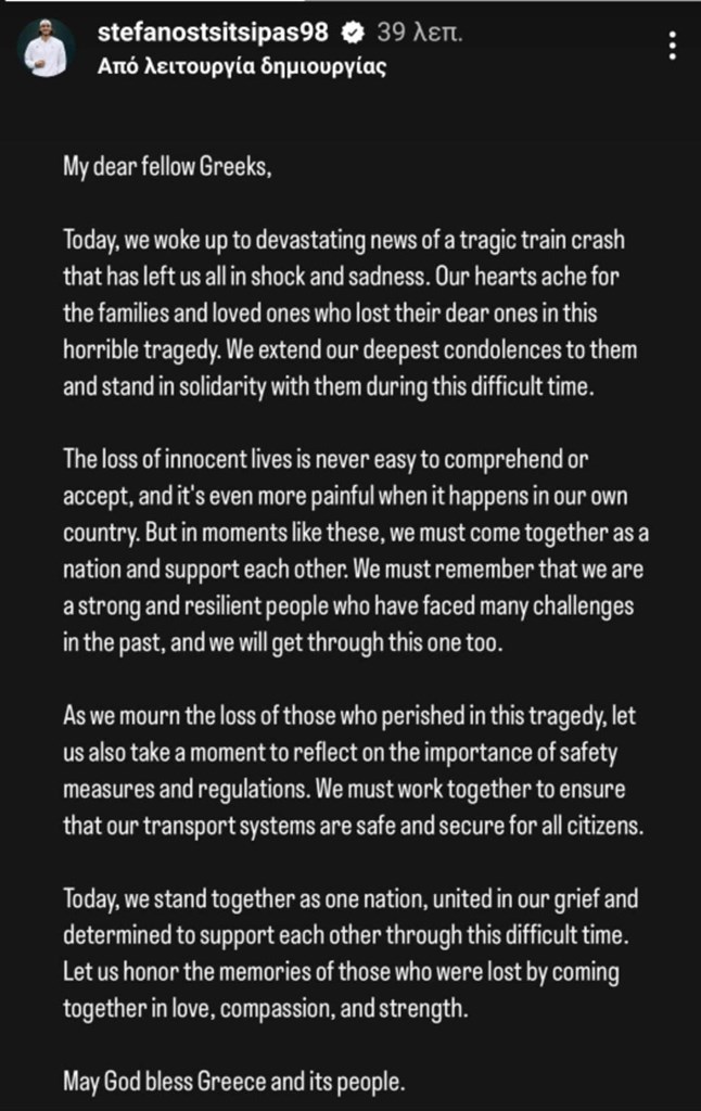 Tα συλλυπητήριά του προς τις οικογένειες των θυμάτων της ανείπωτης τραγωδίας που σημειώθηκε στα Τέμπη εξέφρασε μέσω ενός Instagram story ο Στέφανος Τσιτσιπάς.