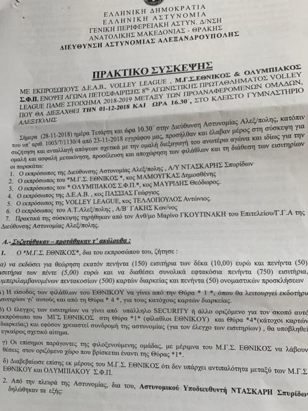 Το sdna.gr παρουσιάζει ένα επίσημο έγγραφο πριν από τον αγώνα του Εθνικού Αλεξανδρούπολης με τον Ολυμπιακό για την 8η αγωνιστική της Volley League της σεζόν 2018-19, που περιγράφει την σύσκεψη με την ΔΕΑΒ για τα μέτρα ασφαλείας.