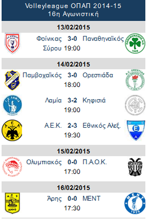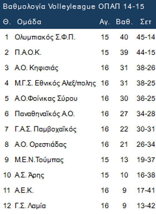 Γκιρτζίκης 7 (4/9 επ, 3 μπλοκ), Γκιμαράες 12 (10/27 επ, 1 άσσος, 1 μπλοκ, 83% υπ – 56% άριστες), Τεσέιρα 15 (14/28 επ, 1 μπλοκ, 62% υπ – 21% άριστες), Χήρας 6 (3/10 επ, 3 μπλοκ), Ντε Σόουζα 4 (3/3 επ, 1 μπλοκ), Μίσιτς 19 (14/28 επ, 4 άσσοι, 1 μπλοκ) / Τσαδήμας (λ, 71% υπ – 25% άριστες), Βλαχόπουλος, Κουτσονίκας, Καββαδάς 1 (1/2 επ, 25% υπ – 25% άριστες)