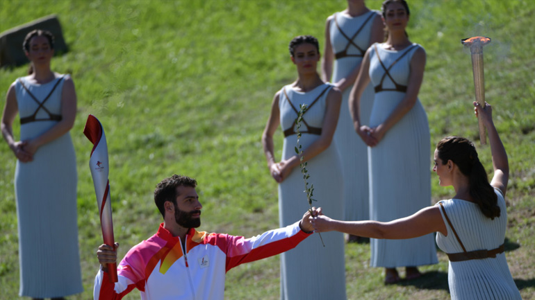 Η Ολυμπιακή Φλόγα άναψε λίγο μετά τις 12 το μεσημέρι, από τις ακτίνες του ηλίου στον Ναό της Ήρας, στην Αρχαία Ολυμπία, λίκνο των αρχαίων Ολυμπιακών Αγώνων.