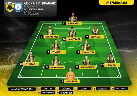 Η ενδεκάδα της ΑΕΚ: Μπαρόχα, Γκάλο, Κολοβέτσιος, Λαμπρόπουλος, Ντίντακ, Γιόχανσον, Σιμόες, Μάνταλος, Μπαρμπόζα, Βάργκας, Αραβίδης