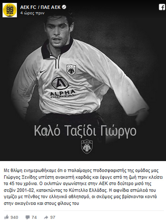 «Με θλίψη ενημερωθήκαμε ότι ο παλαίμαχος ποδοσφαιριστής της ομάδας μας Γιώργος Ξενίδης υπέστη ανακοπή καρδιάς και έφυγε από τη ζωή πριν κλείσει τα 45 του χρόνια.
