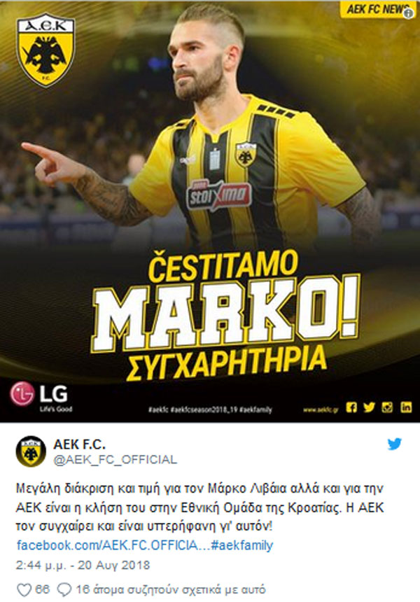Ο πρώτος Κροάτης που καλείται στην εθνική ομάδα της χώρας του ως παίκτης της ΑΕΚ, είναι ο Μάρκο Λιβάγια. Με μήνυμα στην επίσημη σελίδα της στο Facebook η πρωταθλήτρια Ελλάδας δηλώνει υπερήφανη για τον ποδοσφαιριστή που αφίχθη στην Αθήνα πριν από 13 μήνες και έχει ήδη προλάβει να γράψει ιστορία.