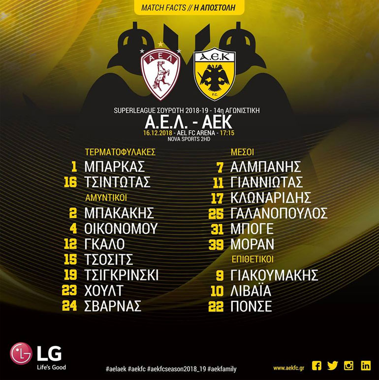Η αποστολή της ΑΕΚ για τον αγώνα με την ΑΕΛ: Μπάρκας, Τσιντώτας, Μπακάκης, Οικονόμου, Γκάλο, Τσόσιτς, Τσιγκρίνσκι, Χουλτ, Σβάρνας, Αλμπάνης, Γιαννιώτας, Κλωναρίδης, Γαλανόπουλος, Μπογέ, Μοράν, Γιακουμάκης, Λιβάια και Πόνσε.