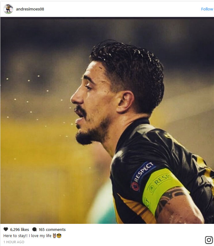 «Εδώ θα μείνω! (σε ελεύθερη μετάφραση) Αγαπώ τη ζωή μου» έγραψε χαρακτηριστικά ο 28χρονος μέσος, ο οποίος βρίσκεται στην Ένωση από το 2015 και πλέον είναι μεταξύ των αρχηγών του συλλόγου.