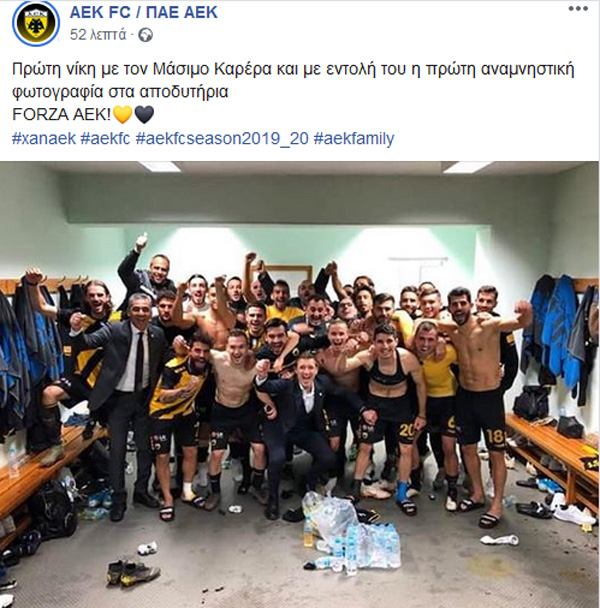 Όπως ήταν φυσικό το κλίμα στα αποδυτήρια της «Ένωσης» μετά τη λήξη του ματς ήταν πανηγυρικό, με τους παίκτες και το τεχνικό τιμ της ομάδας να βγάζουν αναμνηστική φωτογραφία, μετά από εντολή του Μάσιμο Καρέρα.
