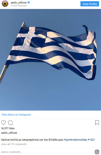 Ανάρτηση στο Instagram με αφορμή την Εθνική επέτειο της 25ης Μαρτίου έκανε η ΠΑΕ ΑΕΚ.