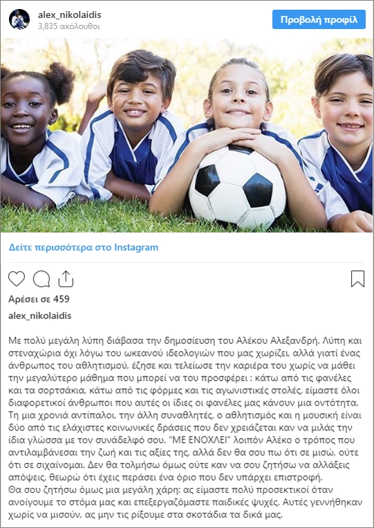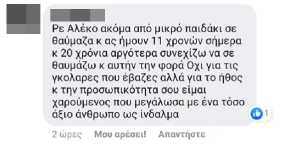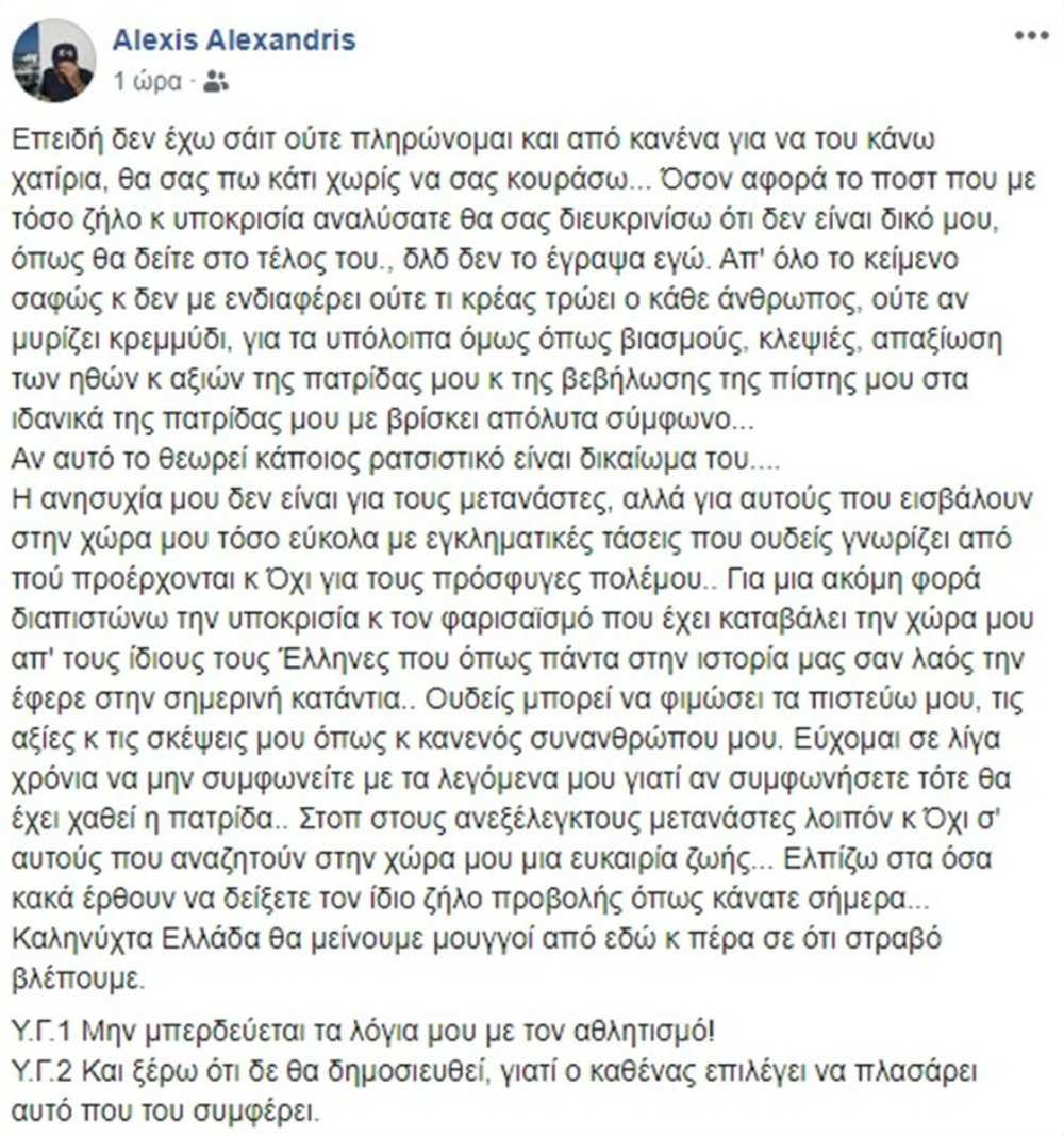 «Με πολύ μεγάλη λύπη διάβασα τη δημοσίευση του Αλέκου Αλεξανδρή.