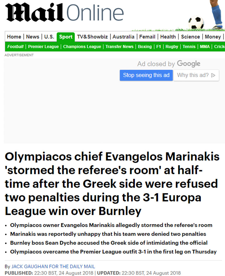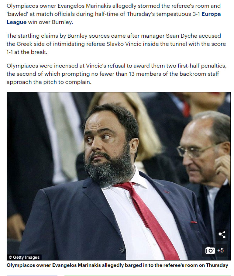 Σύμφωνα με το άρθρο, «ο ιδιοκτήτης του Ολυμπιακού Βαγγέλης Μαρινάκης εισέβαλε στο δωμάτιο του διαιτητή και ούρλιαζε στους αξιωματούχους του αγώνα, στο ημίχρονο του παιχνιδιού με την Μπέρνλι και τη νίκη με 3-1».