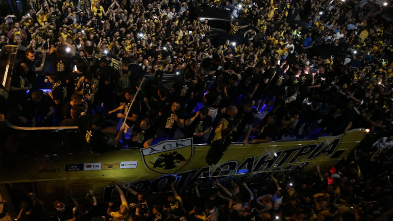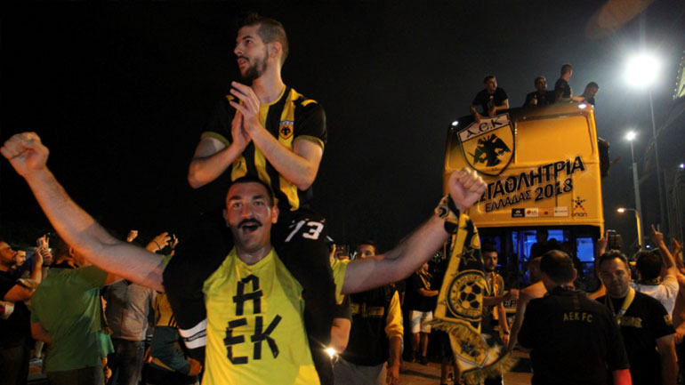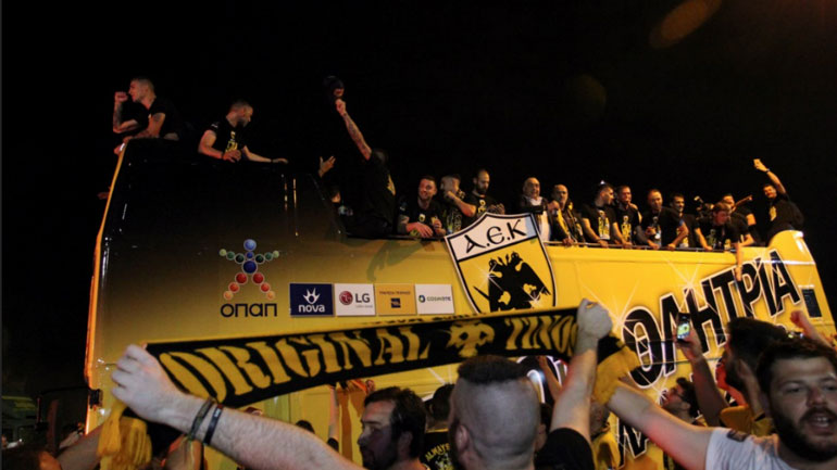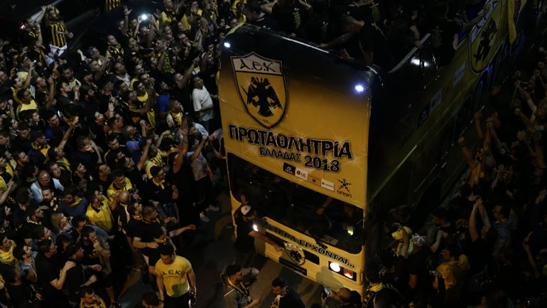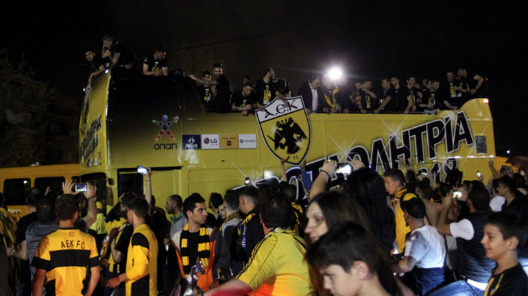 Όλοι οι δρόμοι στη Νέα Φιλαδελφεια ήταν φωταγωγημένοι, με την ατμόσφαιρα να δονείται από τα συνθήματα των 30.000 φίλων της ομάδας, που έκαναν τη νύχτα-μέρα με τα καπνογόνα τους όταν λίγα λεπτά πριν τα μεσάνυχτα έκανε την εμφάνισή του το κιτρινόμαυρο πούλμαν, που μετέφερε τους παίκτες και φυσικά την κούπα του πρωταθλητή.