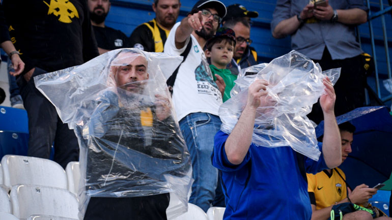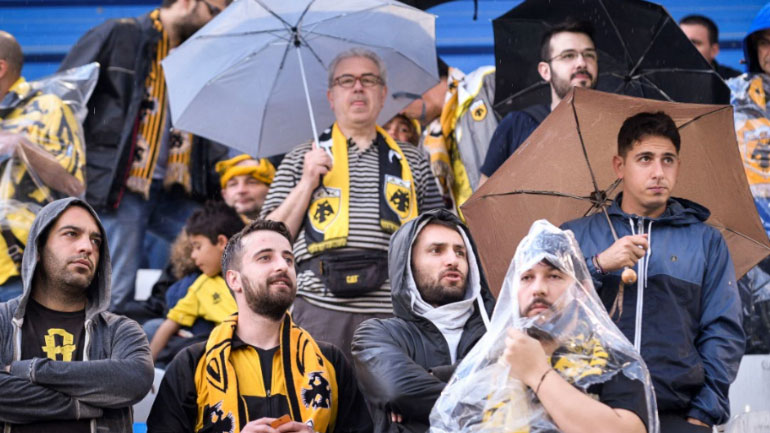 Οι πολύ κακές καιρικές συνθήκες που επικρατούσαν και η καταρρακτώδης βροχή δεν εμπόδισαν τους χιλιάδες οπαδούς της ΑΕΚ να ακολουθήσουν το πούλμαν και με συνθήματα και καπνογόνα να δημιουργήσουν ένα μοναδικό σκηνικό.