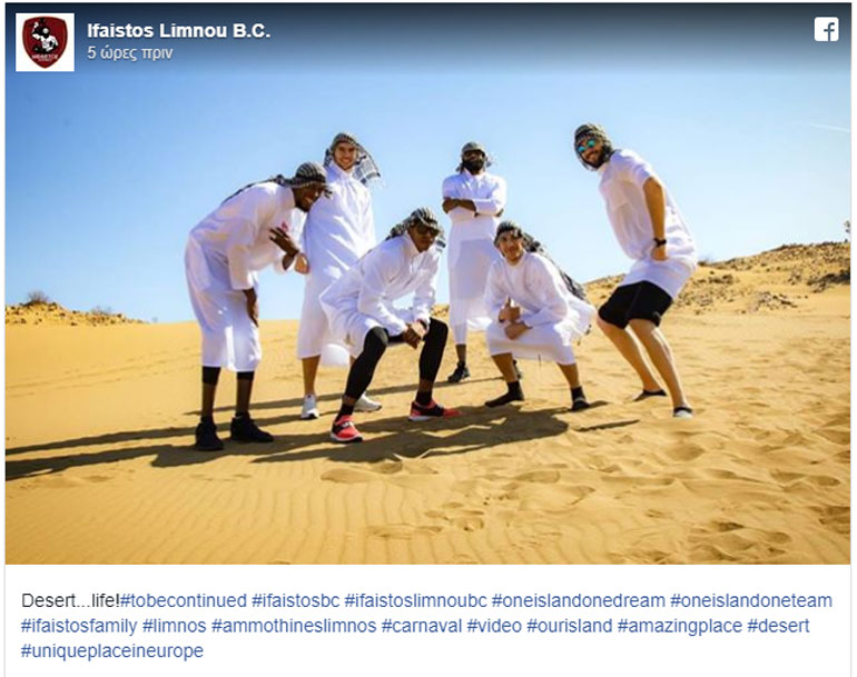 Οι παίκτες της ομάδας μπάσκετ της Λήμνου Ήφαιστος βρέθηκαν την Τετάρτη στις περίφημες Aμμοθίνες μαζί με τηλεοπτικό συνεργείο, για να γυρίσουν ένα διαφημιστικό βίντεο ντυμένοι Άραβες και βεβαίως, όπως κάθε γνήσιος Άραβας, είχαν μαζί τους και τις χανούμισσές τους!