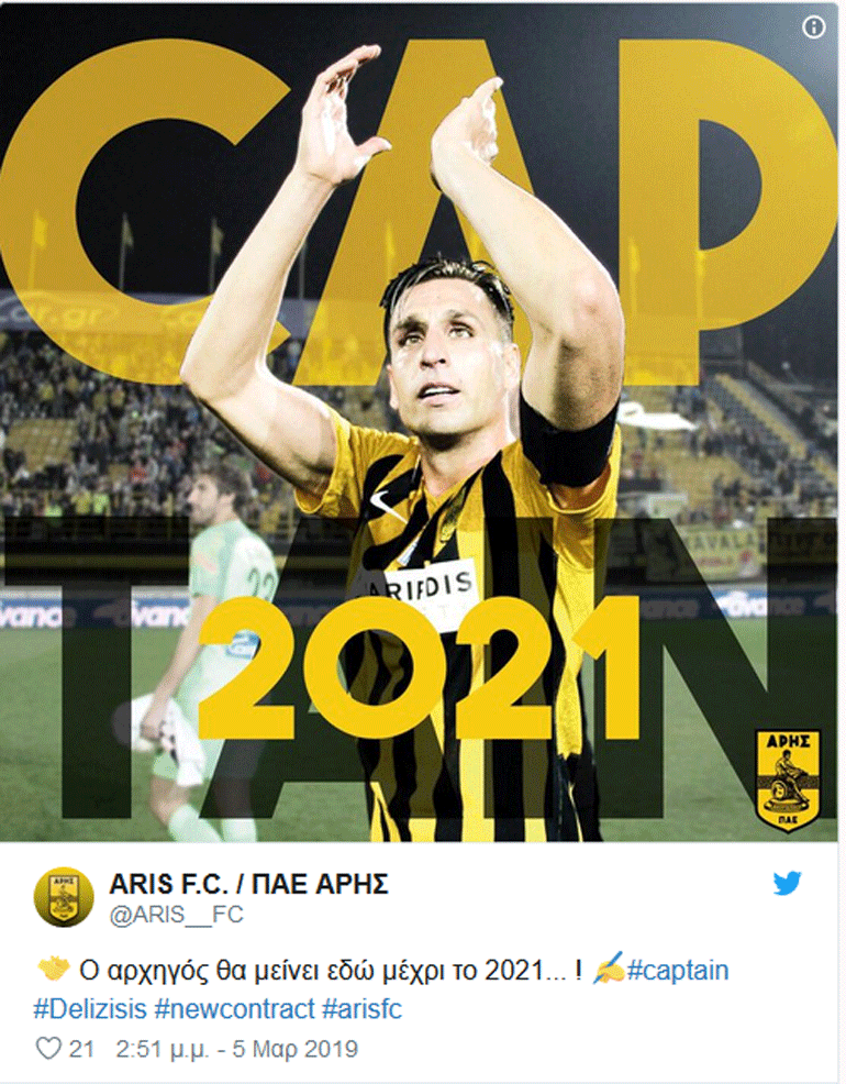 Ο Γιώργος Δεληζήσης θα συνεχίσει να φοράει τη φανέλα του Άρη, καθώς ανανέωσε τη συνεργασία του με τους Θεσσαλονικείς έως το 2021.