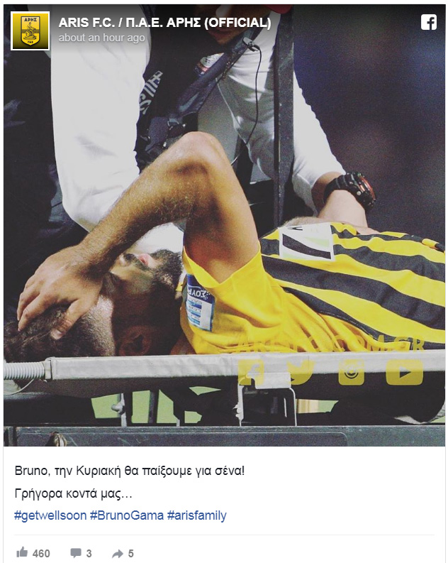 Με αφορμή τον τραυματισμό και την απουσία του από το προσεχές ματς με τον Αστέρα Τρίπολης ο Άρης έστειλε ευχές ανάρρωσης στον Μπρούνο Γκάμα! Μέσω μηνύματος στον επίσημο λογαριασμό που διατηρεί στο Facebook οι «κίτρινοι» ανέφεραν: