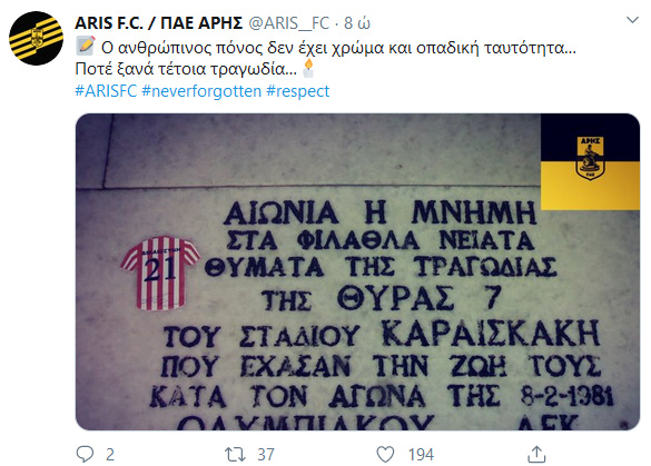 Με ανάρτησή της στα Social Media, η ΠΑΕ Άρης αναφέρθηκε στην τραγωδία της Θύρας 7, που σημειώθηκε σαν σήμερα, στις 8 Φεβρουαρίου του1981.