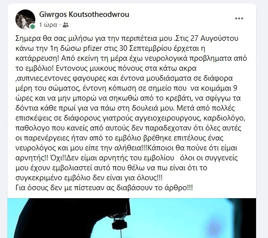«Σήμερα θα σας μιλήσω για την περιπέτειά μου. Στις 27 Αυγούστου κάνω την 1η δόση pfizer, στις 30 Σεπτεμβρίου έρχεται η κατάρρευση! Από εκείνη τη μέρα έχω νευρολογικά προβλήματα από το εμβόλιο!