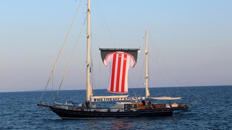 Το «κλου» της εκδήλωσης είναι το γεγονός ότι η καινούργια φανέλα των Πειραιωτών εμφανίστηκε σε… γιγαντιαία μορφή πάνω σε ένα ιστιοφόρο.