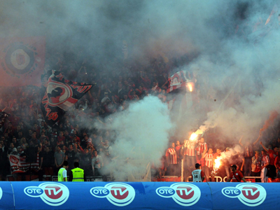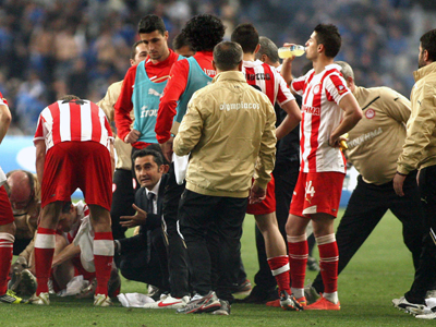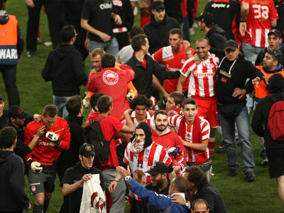 Δεν κατάφεραν ποτέ να προσεγγίσουν τους φίλους της ομάδας του Περιστερίου, αφού εμποδίστηκαν από τους άνδρες ασφαλείας. Στη συνέχεια υπήρξαν κάποιες αψιμαχίες μεταξύ των οπαδών του Ολυμπιακού με τους υπευθύνους ασφαλείας, ενώ σύσσωμο το γήπεδο αποδοκίμασε τους συγκεκριμένους οπαδούς που εισέβαλαν στον αγωνιστικό χώρο.