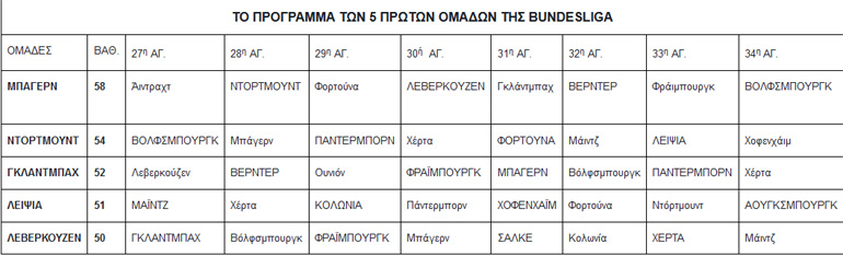 Δείτε το πρόγραμμα των 5 πρώτων ομάδων στις 8 τελευταίες αγωνιστικές της Bundesliga (με κεφαλαία γράμματα οι εκτός έδρας αγώνες):