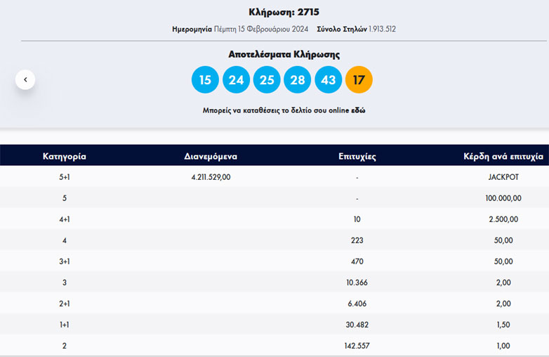Οι τυχεροί αριθμοί: 15, 24, 25, 28, 43. TZΟΚΕΡ: 17.