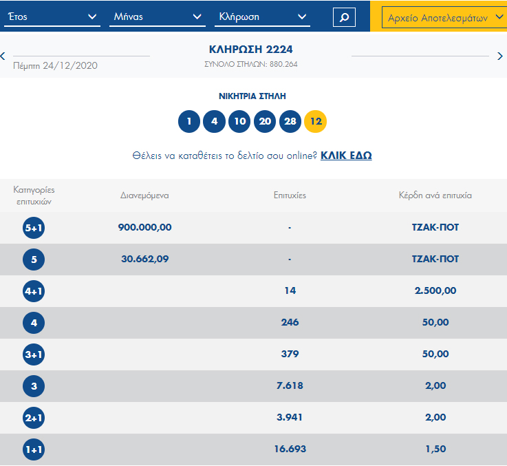 Διπλό τζακ ποτ στο Τζόκερ σημειώθηκε στην σημερινή κλήρωση του Τζόκερ, καθώς δεν βρέθηκαν νικητές στις δύο πρώτες κατηγορίες. Οι αριθμοί που κληρώθηκαν είναι οι εξής: 1, 4, 10, 20, 28 και ΤΖΟΚΕΡ: 12