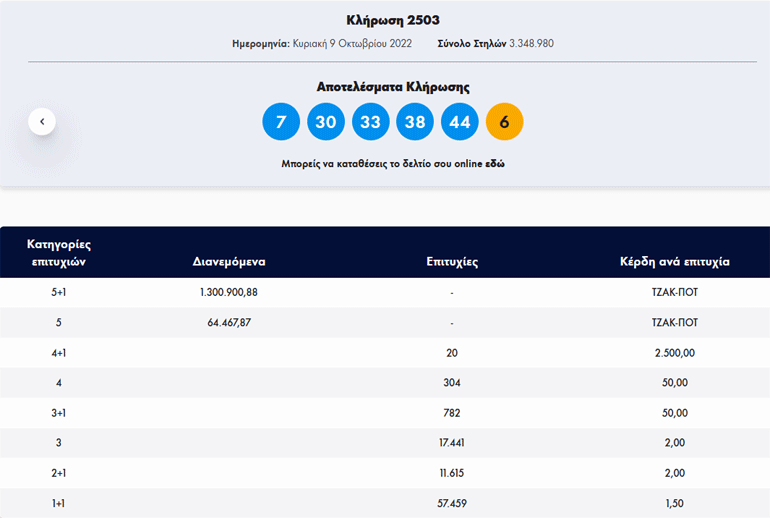 Χωρίς νικητές στις δύο πρώτες κατηγορίες ολοκληρώθηκε την Κυριακή (9/10) η κλήρωση και η διαλογή στο Τζόκερ. Οι τυχεροί αριθμοί της αποψινής κλήρωσης...