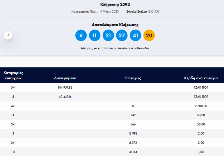 Χωρίς νικητές στις δύο πρώτες κατηγορίες ολοκληρώθηκε την Πέμπτη (4/5) η κλήρωση και η διαλογή στο Τζόκερ. Οι τυχεροί αριθμοί: 6, 11, 21, 27, 41. ΤΖΟΚΕΡ...