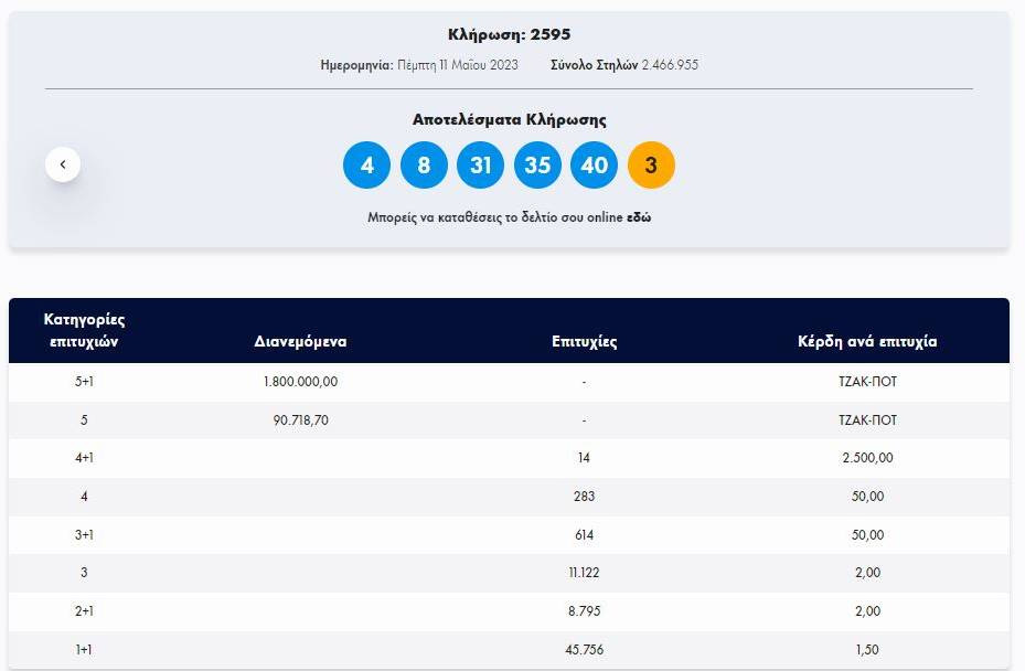 Χωρίς νικητές στις δύο πρώτες κατηγορίες ολοκληρώθηκε την Πέμπτη (11/5) η κλήρωση του Τζόκερ για τα 1,8 εκατ. ευρώ...