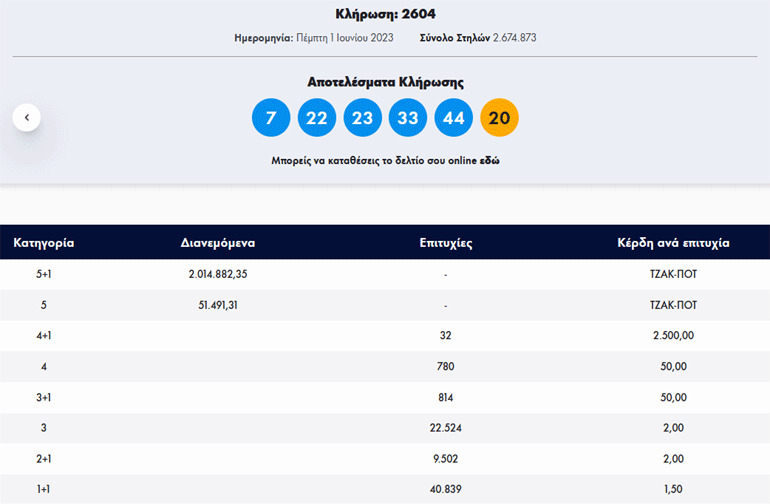 Χωρίς νικητές στις δύο πρώτες κατηγορίες ολοκληρώθηκε την Πέμπτη (1/6) η κλήρωση του Τζόκερ. Οι τυχεροί αριθμοί: 7, 22, 23, 33, 44. ΤΖΟΚΕΡ: 20.